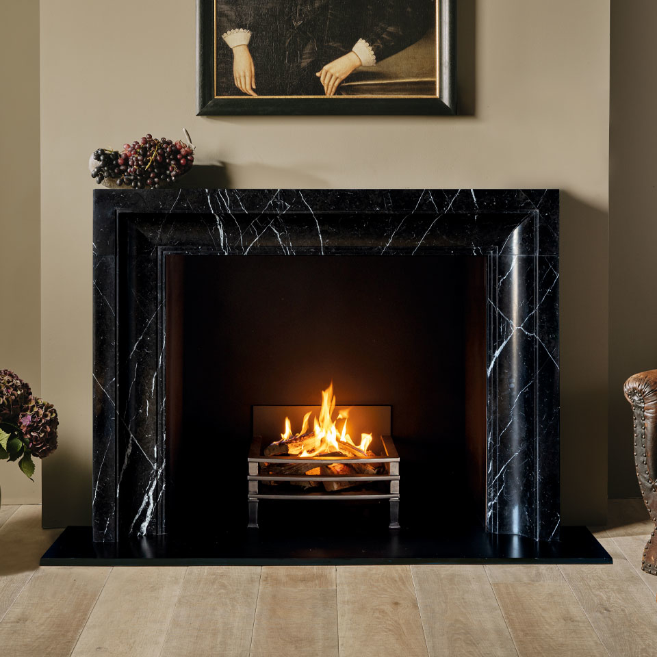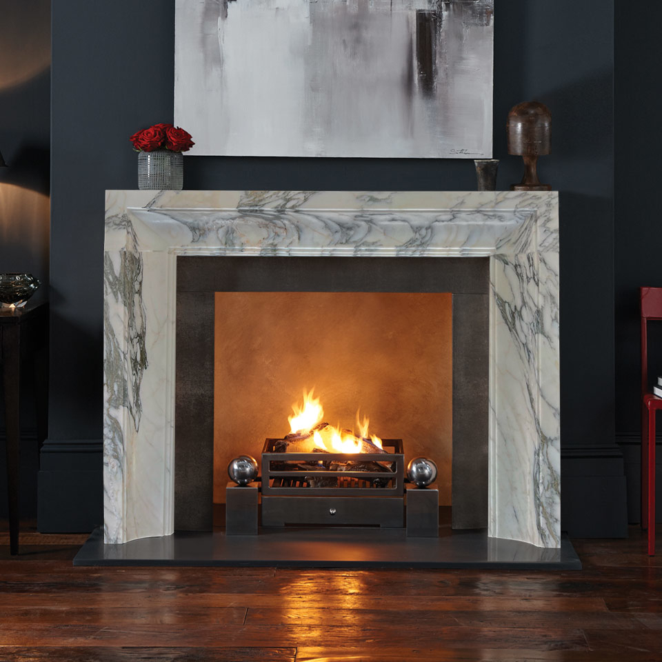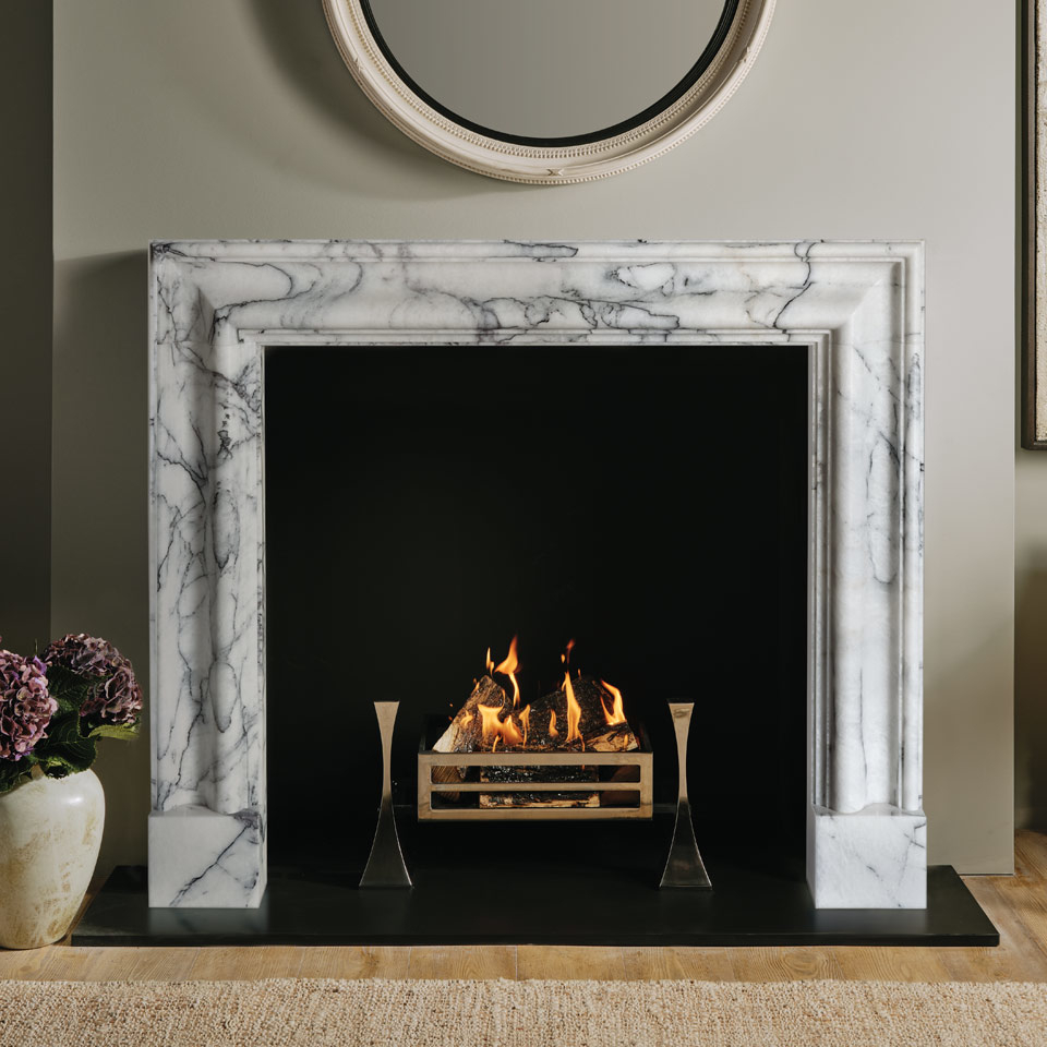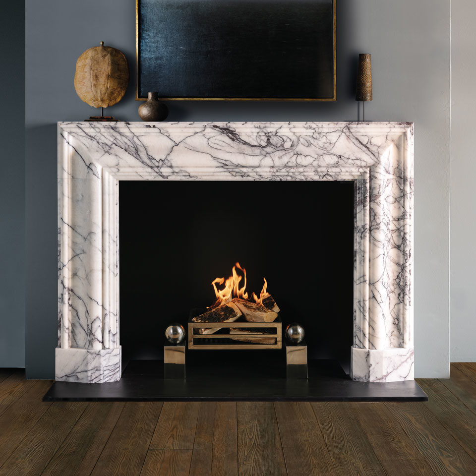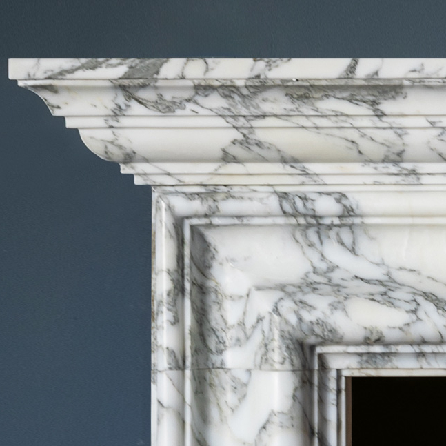 Taking its inspiration from the late 17th century bolection profile that Sir Christopher Wren borrowed from Italian architecture, The Alderney is shown in vibrantly veined Arabescato marble from Carrara.
