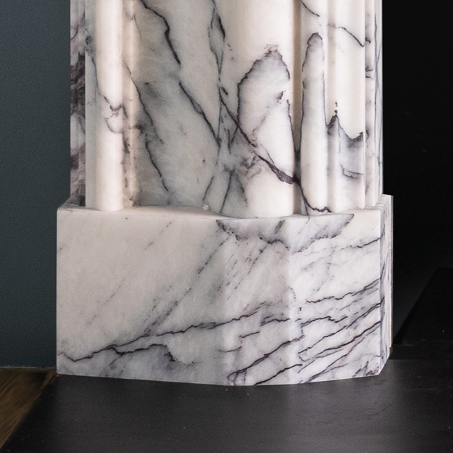 The Milo is a fire surround of substantial proportions that features an elegant bolection moulded frame elevated above canted block feet. Shown here in Lilac marble from Antalya in Turkey.