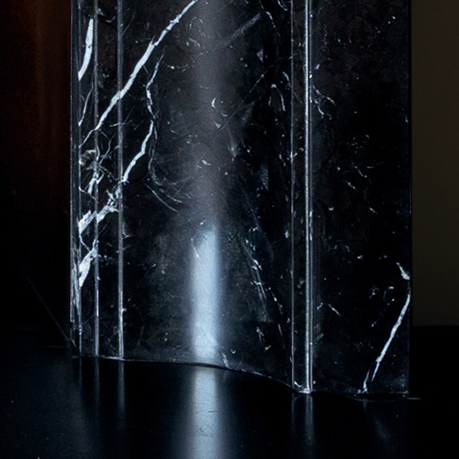 Seen here in Nero Marquina marble, The Scarpa has the elegance of an Art Deco design and features deeply curved concave ingrounds framing the opening to the fire chamber.