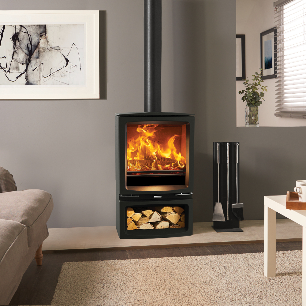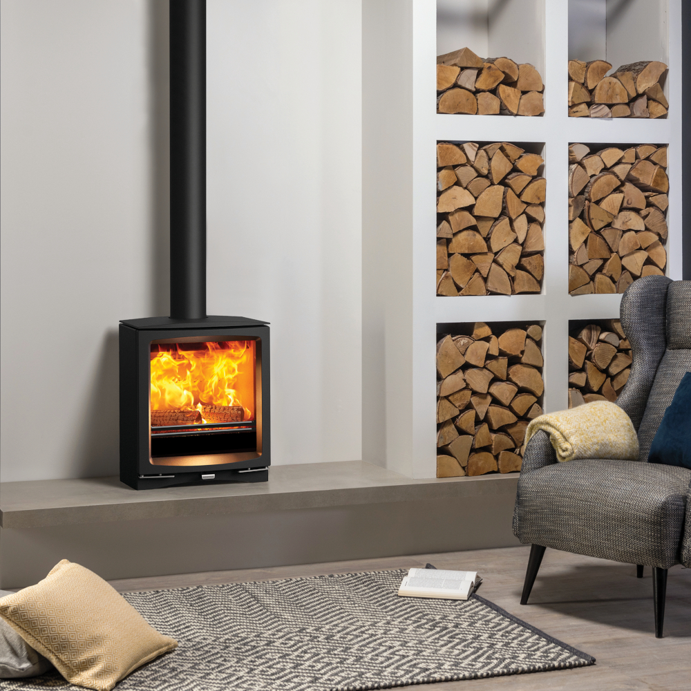 Presenting a stunning view of the flames, Vogue models feature a signature bevelled cast iron door with an expansive glass viewing window, kept clear by the powerful Airwash system that also aids the range’s high levels of combustion efficiency.