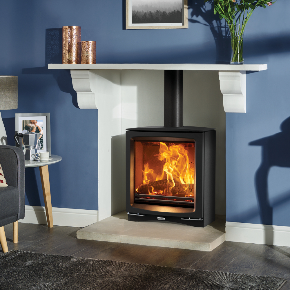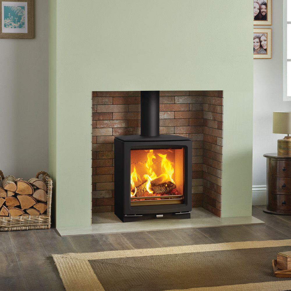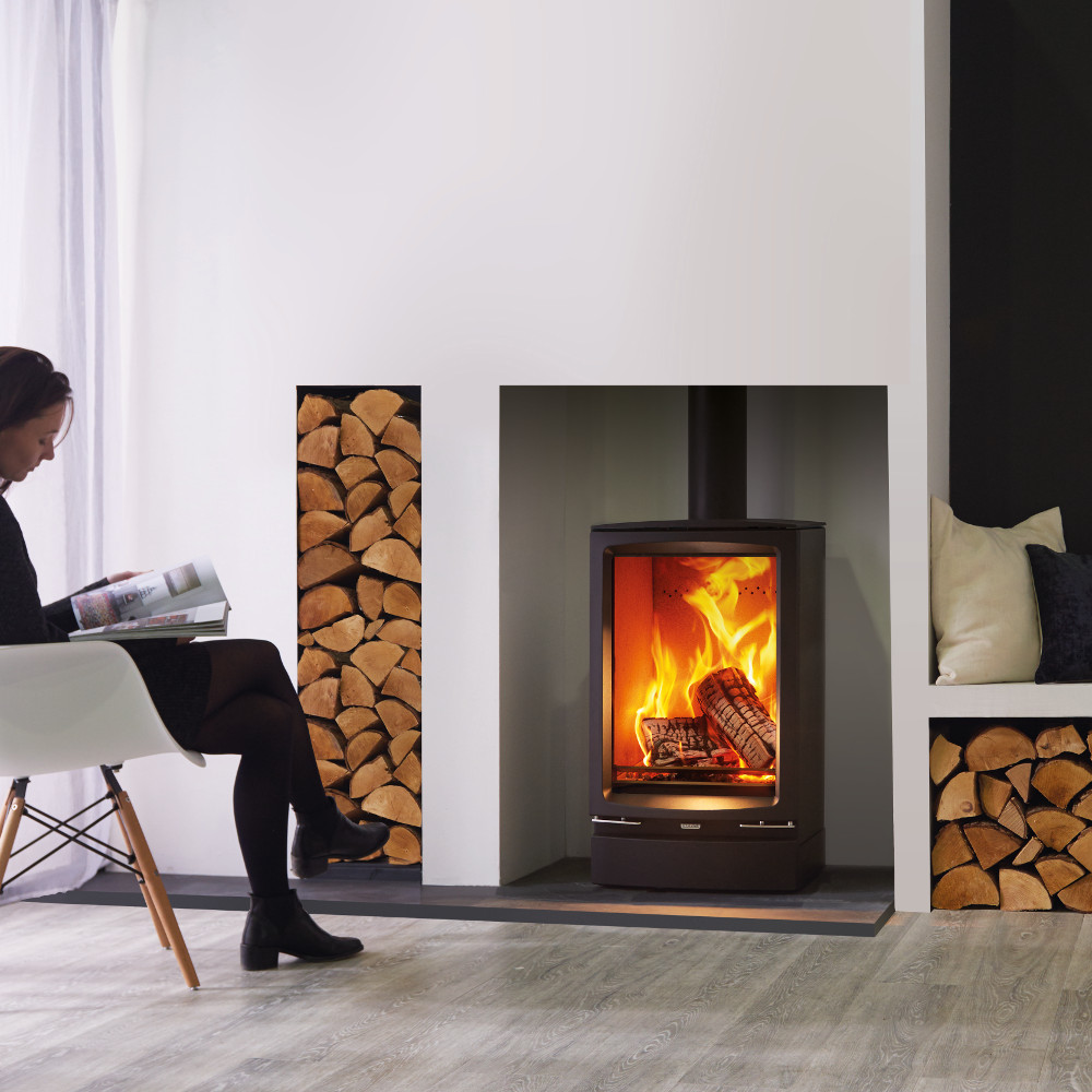 Presenting a stunning view of the flames, Vogue models feature a signature bevelled cast iron door with an expansive glass viewing window, kept clear by the powerful Airwash system that also aids the range’s high levels of combustion efficiency.
