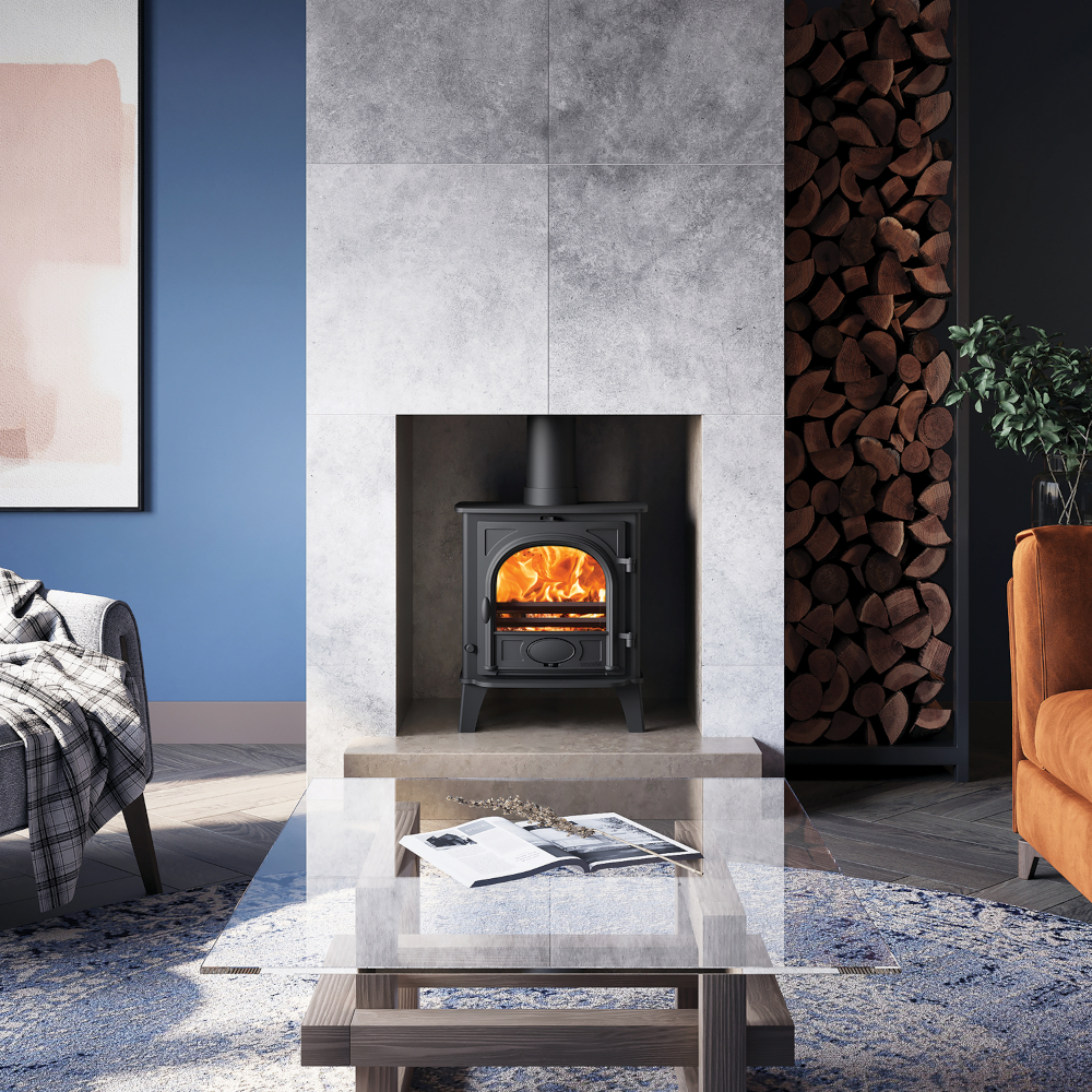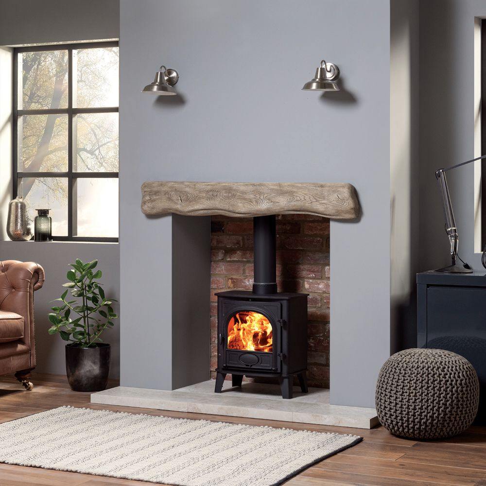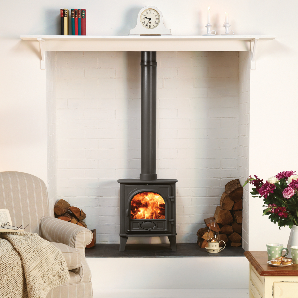 The Stovax Stockton 5 Ecodesign Plus stove offers you a mid-sized stove that is larger than the Stockton 3 or Stockton 4, and is available as either a wood burning stove or as a multi-fuel model with external riddling. The additional width allows you to load up to 13″ (330mm) in length.