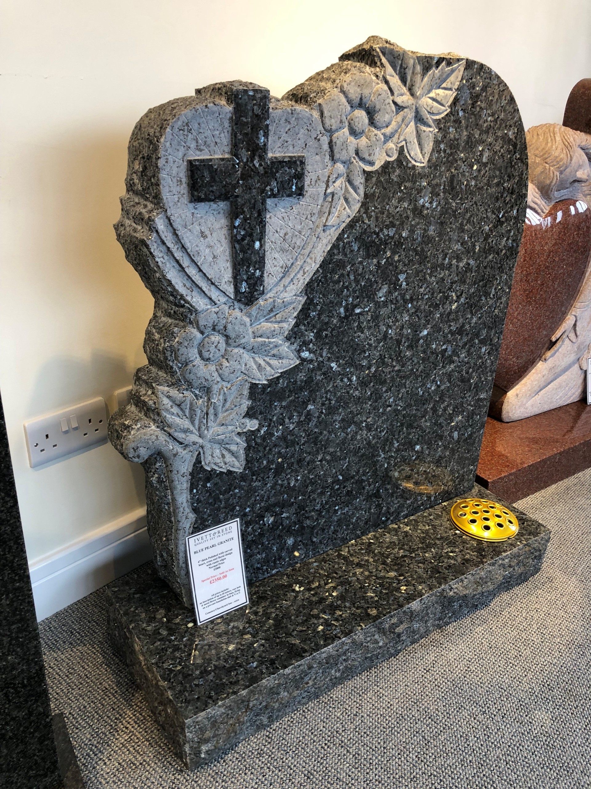 Memorial in Blue Pearl Granite with Carved Heart, Cross & Floral Designs with Rustic Edges.