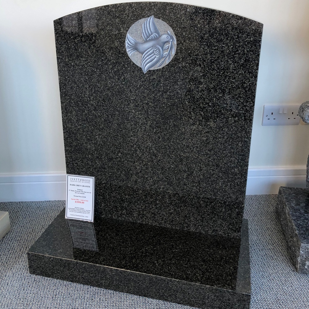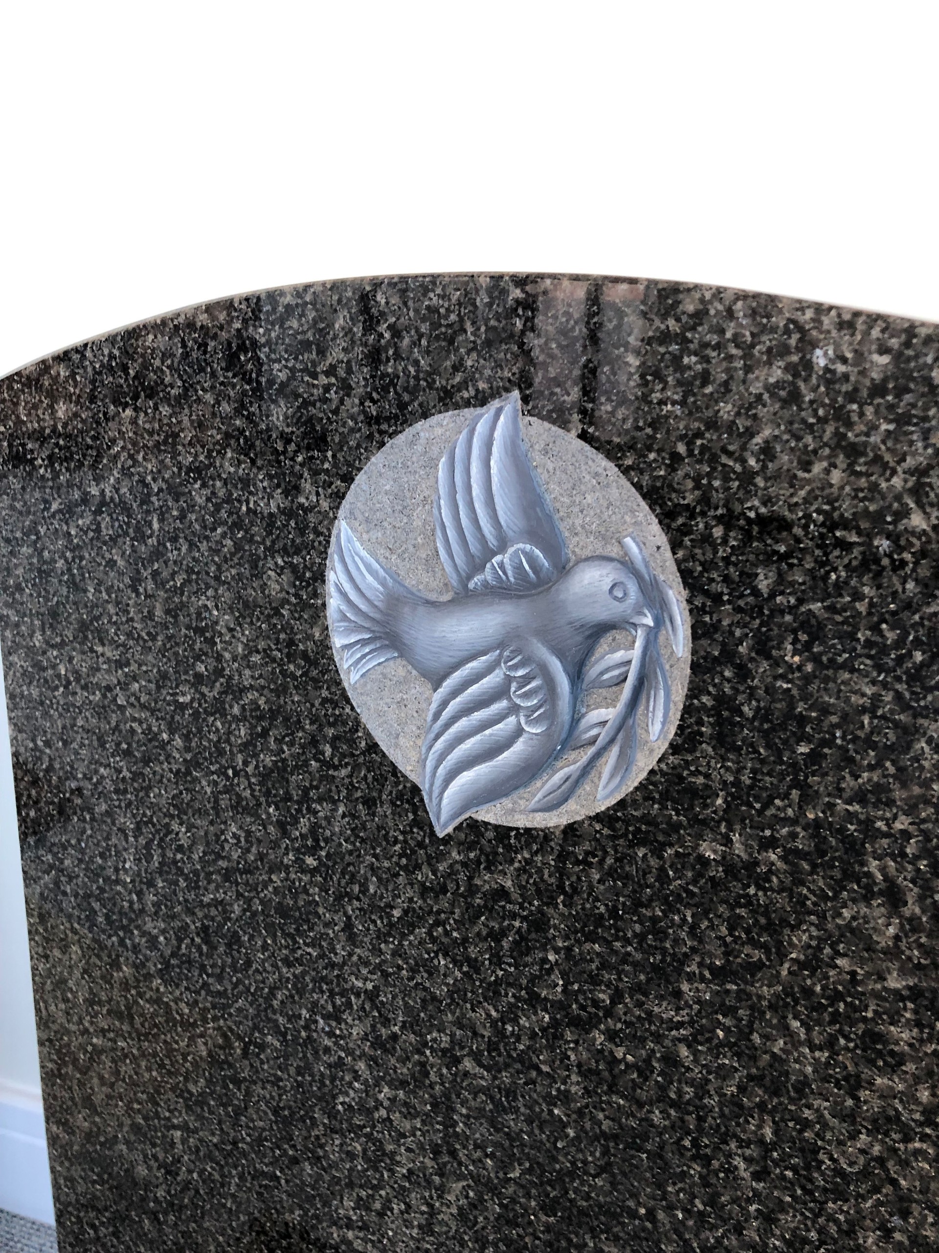 Memorial in Dark Grey Granite, Oval Top with Deep Carved Dove in Roundel