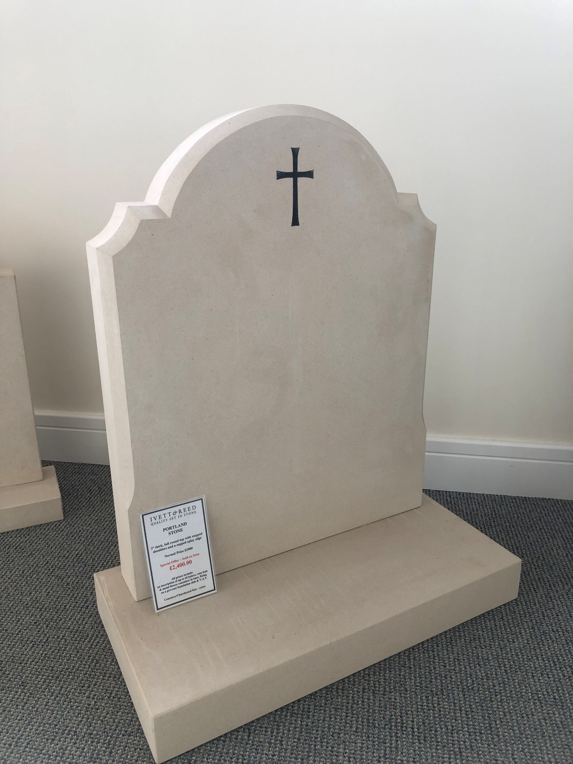 Memorial in Portland Stone, Full Round Top with Stepped Shoulders, Stopped Splay Edge & Cross Design