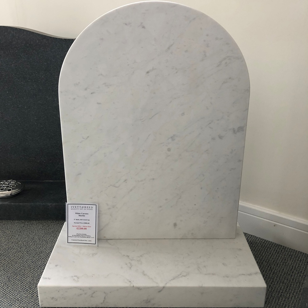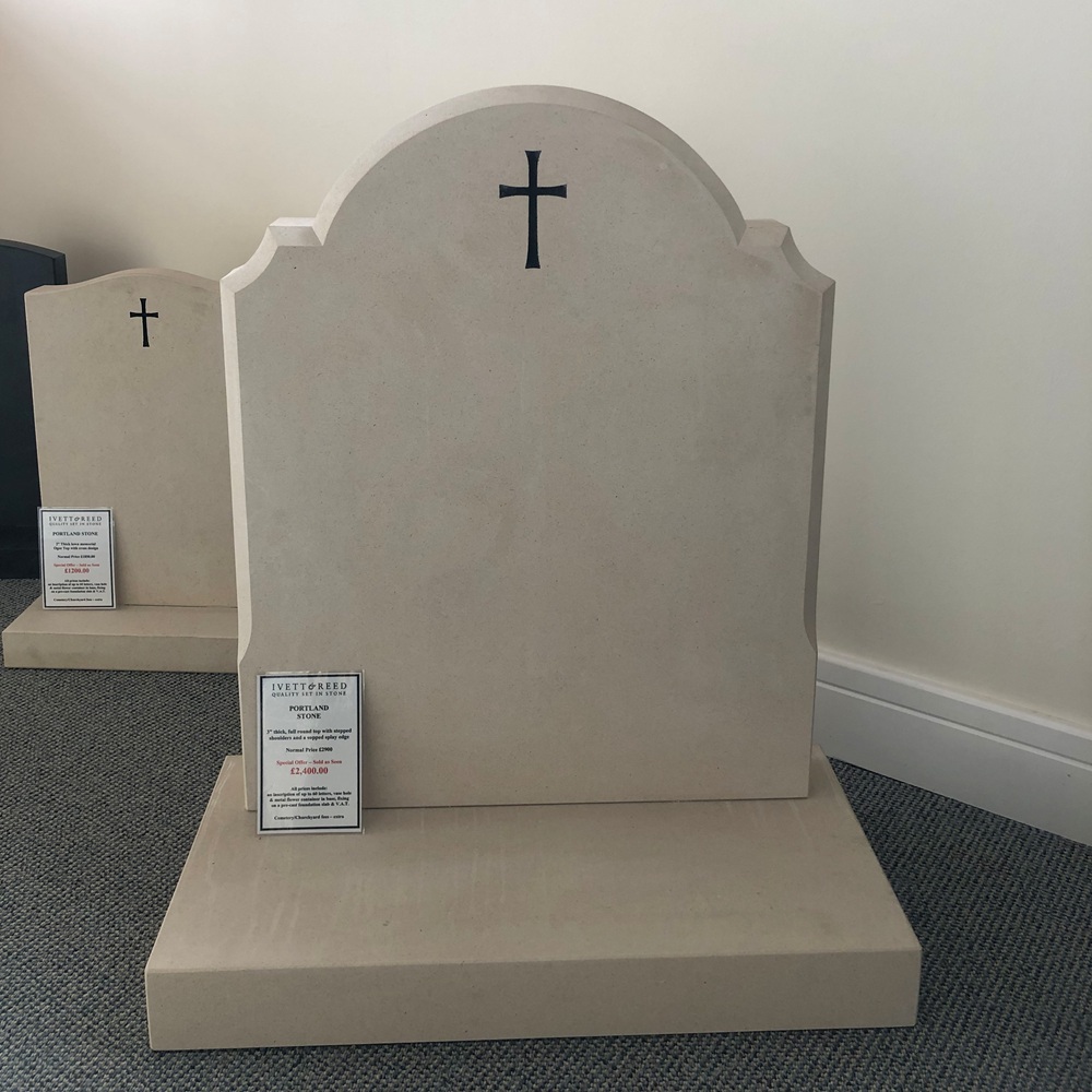 Memorial in Portland Stone, Full Round Top with Stepped Shoulders, Sopped Splay Edge & Cross Design