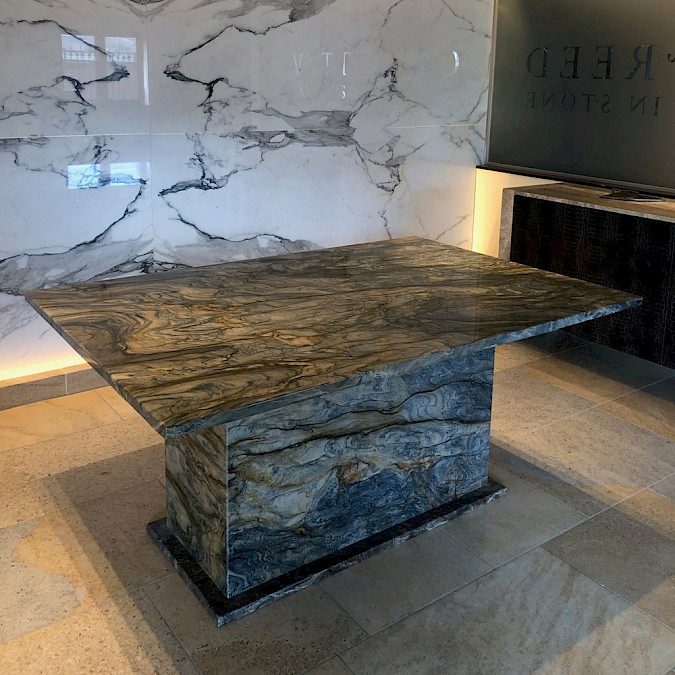 Large table in Blue Fusion granite. Ex-display sold as seen, for collection from our showroom in Cambridge.
