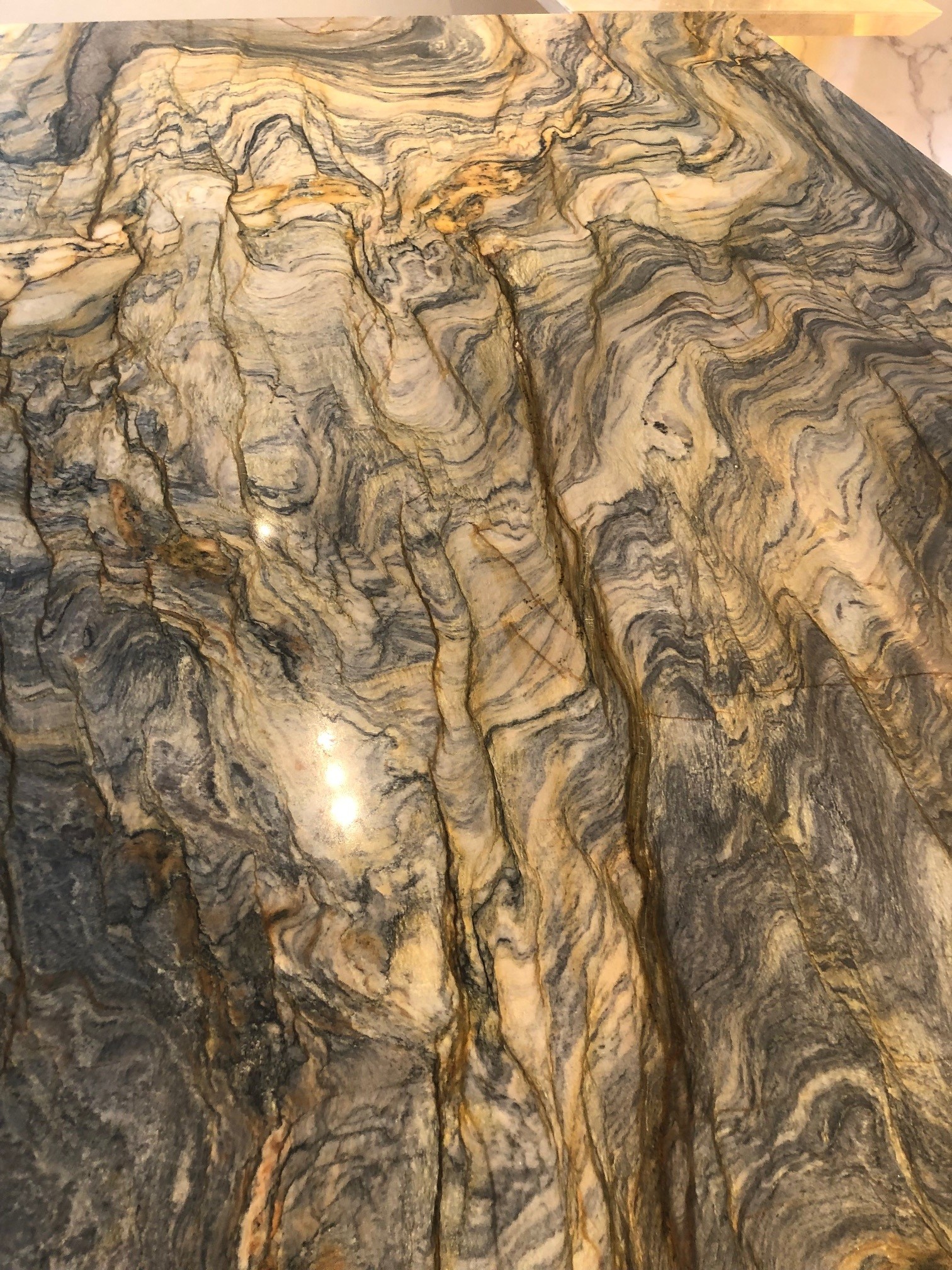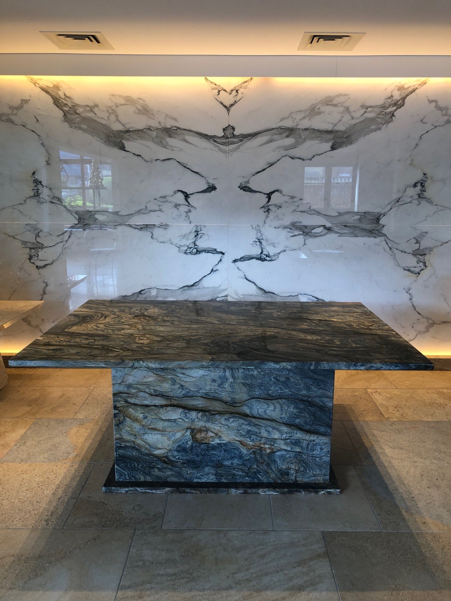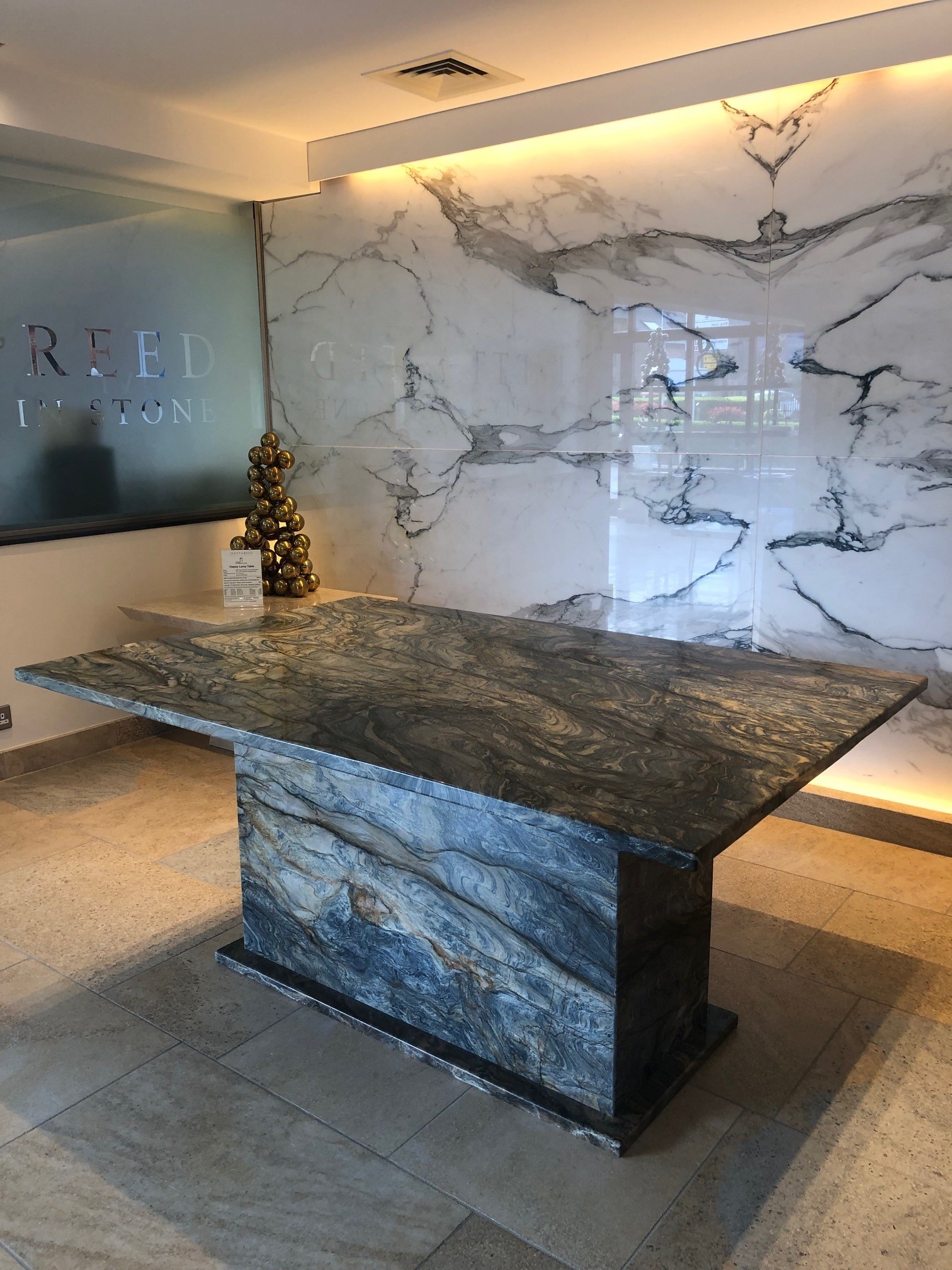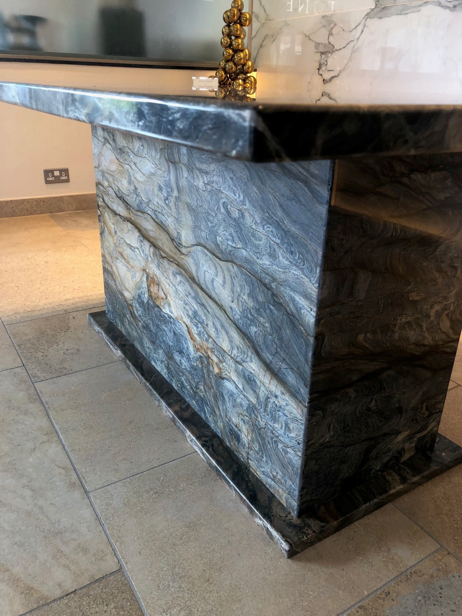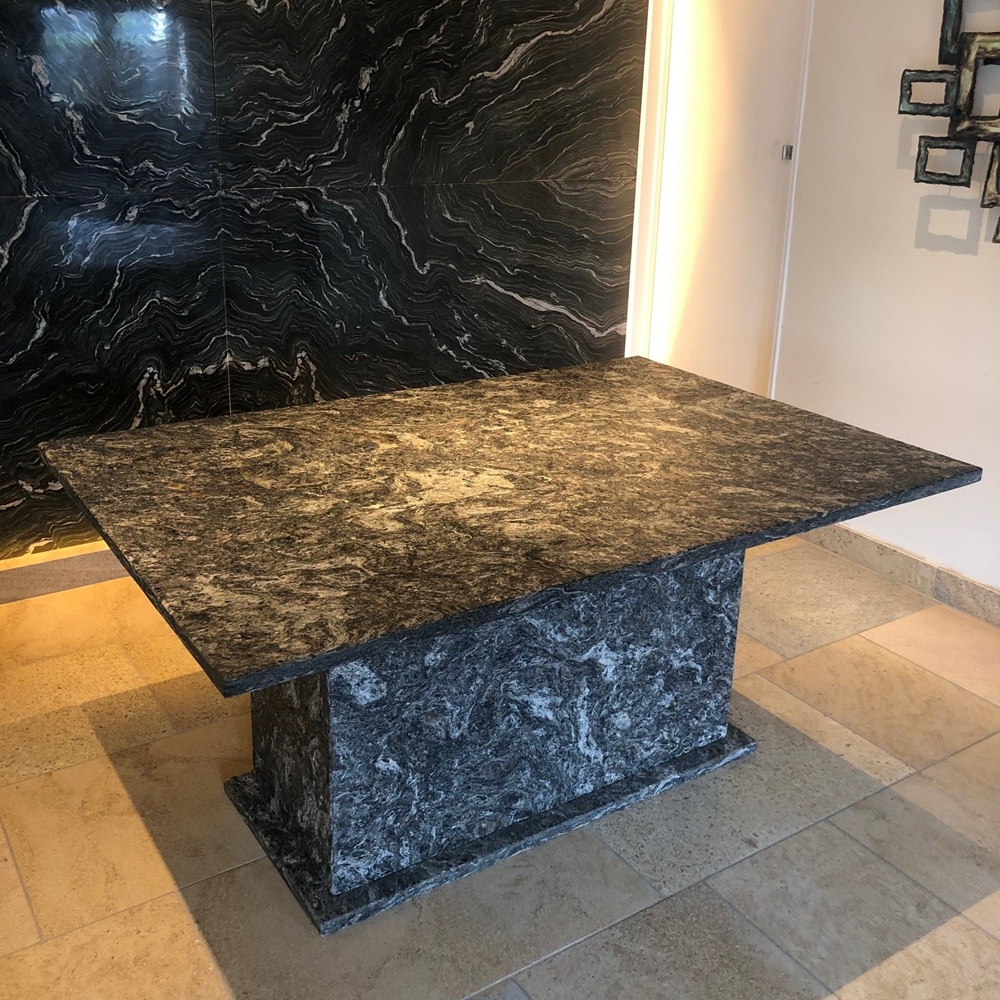 - Blue Fusion Granite 30mm thick table top and matching Base Support. Polished finish, double pencil round edge & softened corners.