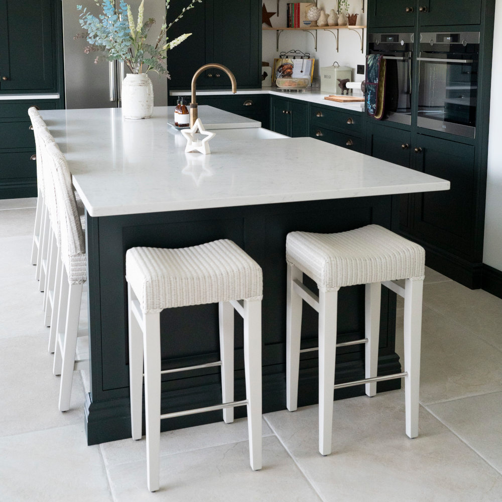 This installation features a large island with butler sink cut-out, draining grooves and overhang for seating. The perimeter includes worktop runs and upstands either side of the oven towers, including a hob cut-out.