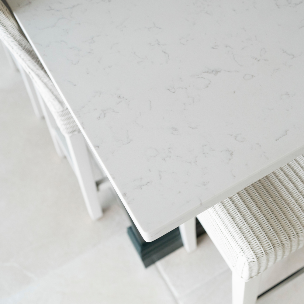 Bianco Venatino is a Carrara marble-effect quartz surface, with its timeless pale grey-white background and random scattered grey veins.