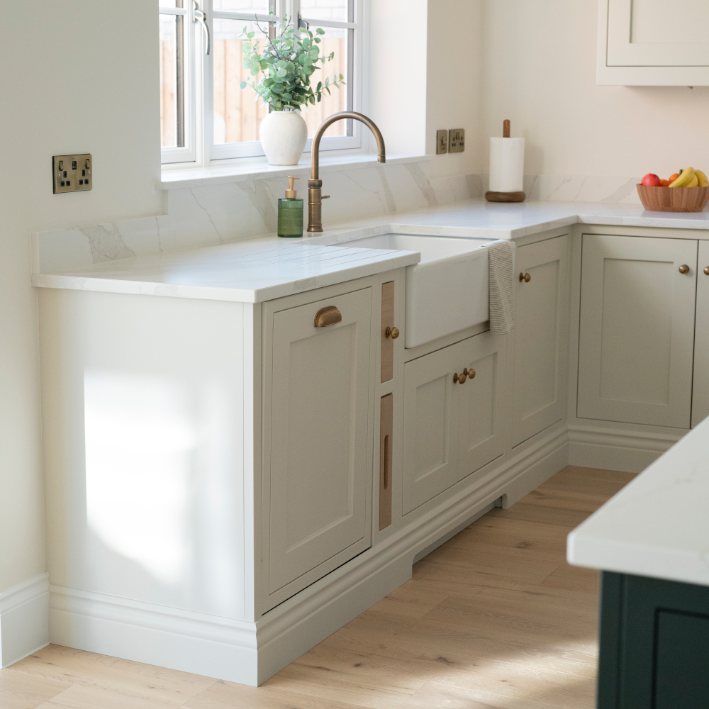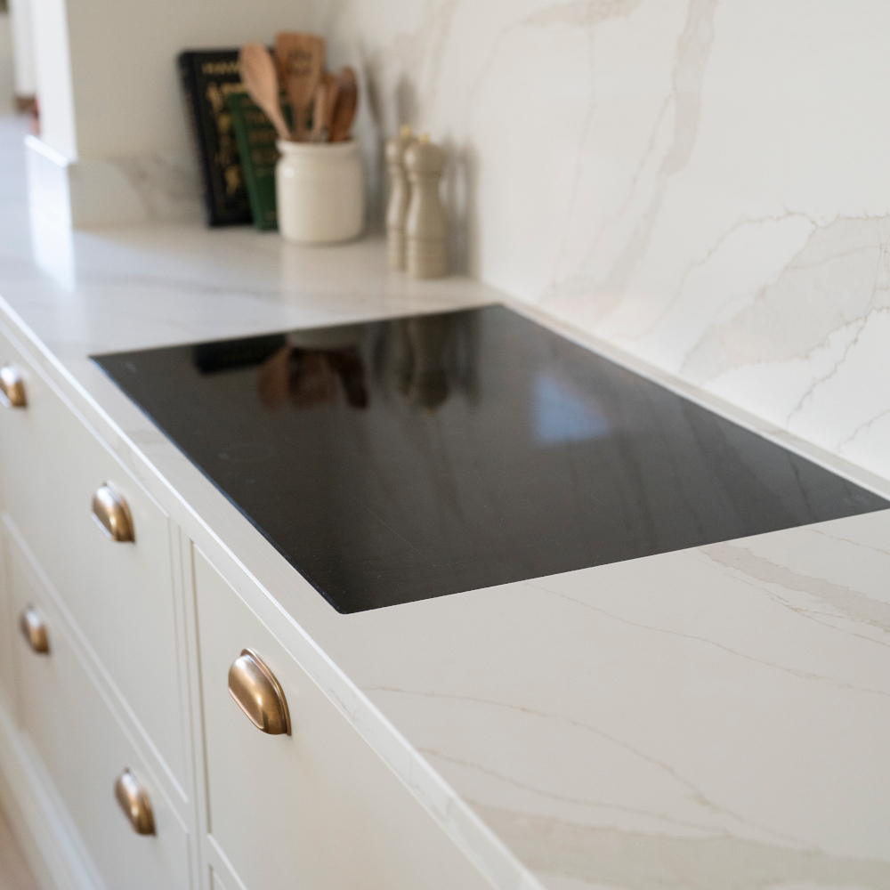 This installation features a large island worktop, hob run (featuring recessed hob cut-out) with large splashback set into a false chimney breast, polished Butler sink cut-out with draining grooves, upstands and window sill.