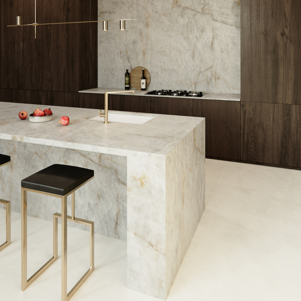 This quartzite is a stunning natural stone with translucent white to light grey hues and subtle veining. A surface to fall in love with.