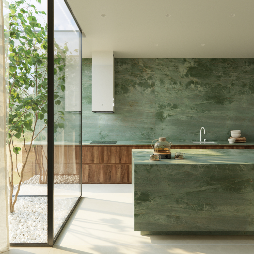 Itara is the name Sensa has given to the exclusive stain-resistant finish of the Brazilian Verde Esmeralda quartzite. Its bright white and sandy veins, set against a watery green background reminiscent of a stormy sea, make it the perfect partner for kitchen and bathroom worktops.