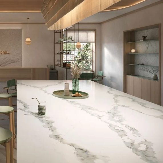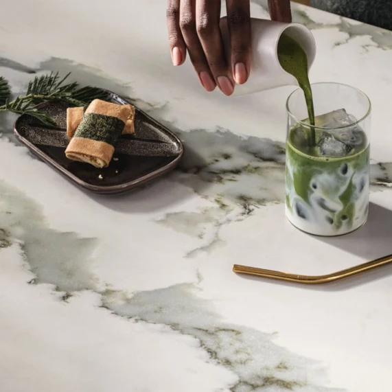 Calacatta Thyme blends the revival of green marbles with luxurious veining in translucent sage and grey, accented by dark green and white aggregates. This stunning material makes a bold statement in both residential and hospitality spaces, beautifully complementing dark wood finishes and metallic hardware.