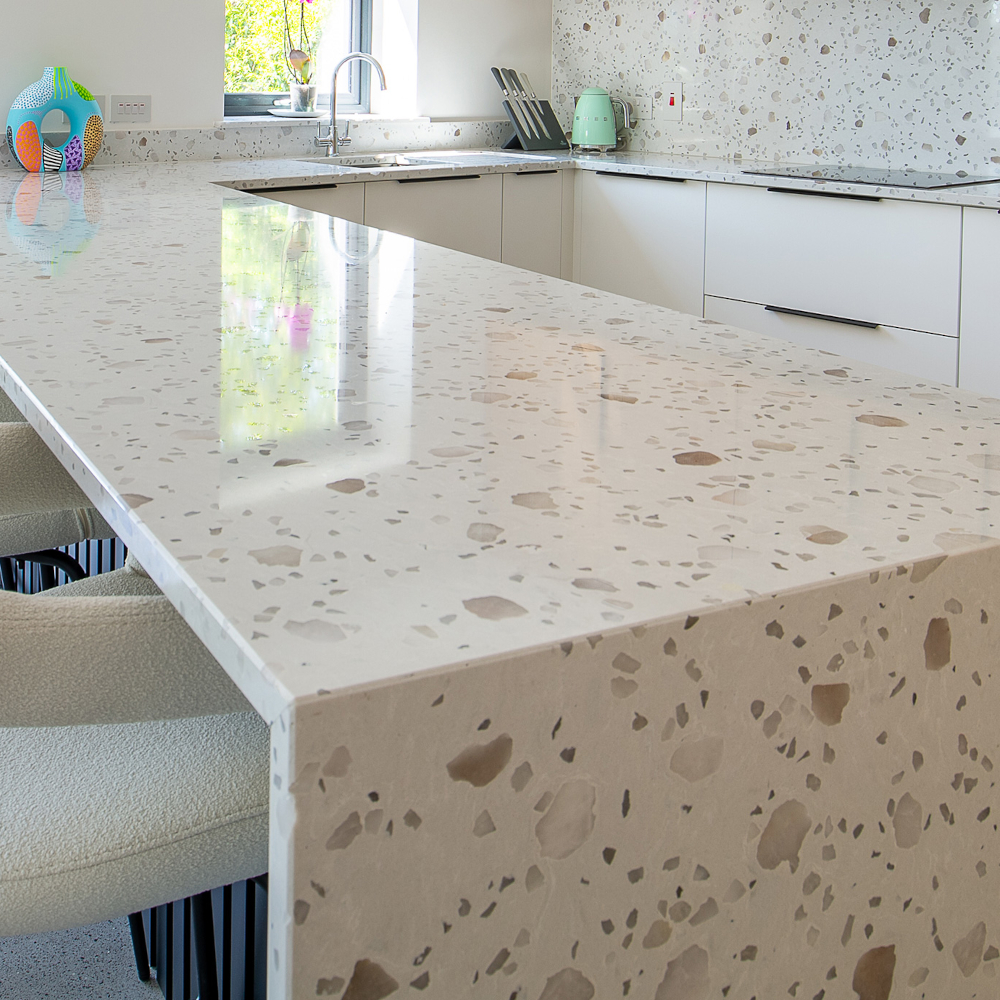 Featuring an unmistakable Terrazzo design, the traditional and natural coarse grain of Venetian Grande is a timeless reflection of modern style that exudes luxury. Pair this durable quartz surface with light woods, brushed metals, and soft pastel colours for a playful ambience in any space.
